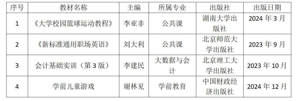 為貫徹落實(shí)教育部關(guān)于教材建設(shè)的相關(guān)要求,進(jìn)一步提升我院教材建設(shè)水平,根據(jù)《教育部辦公廳關(guān)于組織開(kāi)展第二批“十四五”職業(yè)教育國(guó)家規(guī)劃教材遴選工作的通知》(教職成廳函【2025】1號(hào))要求,經(jīng)各教學(xué)單位推薦、學(xué)院教材建設(shè)委員會(huì)評(píng)審,現(xiàn)將擬推薦申報(bào)“十四五”職業(yè)教育國(guó)家規(guī)劃教材的名單予以公示。