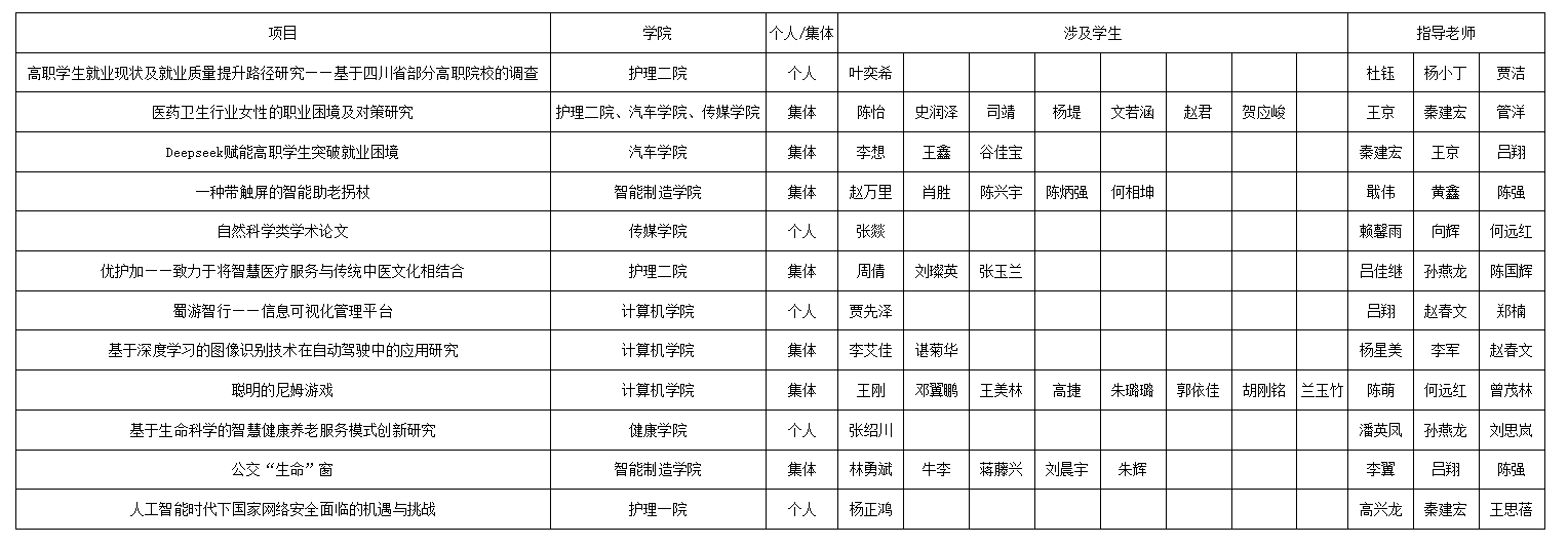 經(jīng)專家線下評審,最終3個(gè)項(xiàng)目獲得一等獎(jiǎng),4個(gè)項(xiàng)目獲得二等獎(jiǎng),5個(gè)項(xiàng)目獲得三等獎(jiǎng),10個(gè)優(yōu)秀獎(jiǎng)。按照《關(guān)于舉辦第十八屆“挑戰(zhàn)杯”四川省大學(xué)生課外學(xué)術(shù)科技作品競賽的預(yù)通知》要求,我校省賽可推報(bào)12件作品。按照校賽決賽得分排名高低,結(jié)合我校實(shí)際情況,現(xiàn)將推報(bào)名單公示如下: