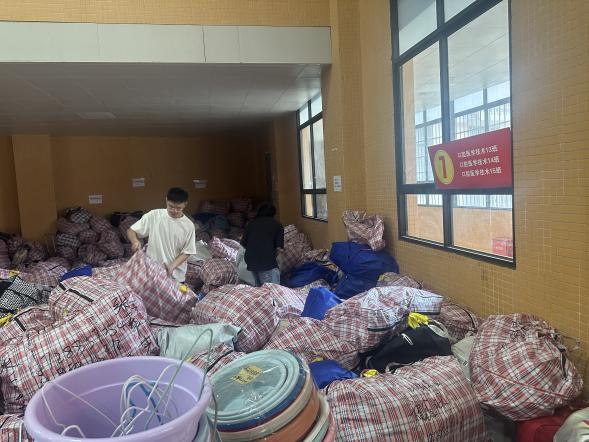 完成報(bào)到手續(xù)后,學(xué)生們按照指引前往5號(hào)教學(xué)樓大廳領(lǐng)取個(gè)人行李。行李領(lǐng)取處負(fù)責(zé)輔導(dǎo)員熱情周到地幫助學(xué)生搬運(yùn)和整理行李,確保每位學(xué)生都能順利拿到自己的物品。